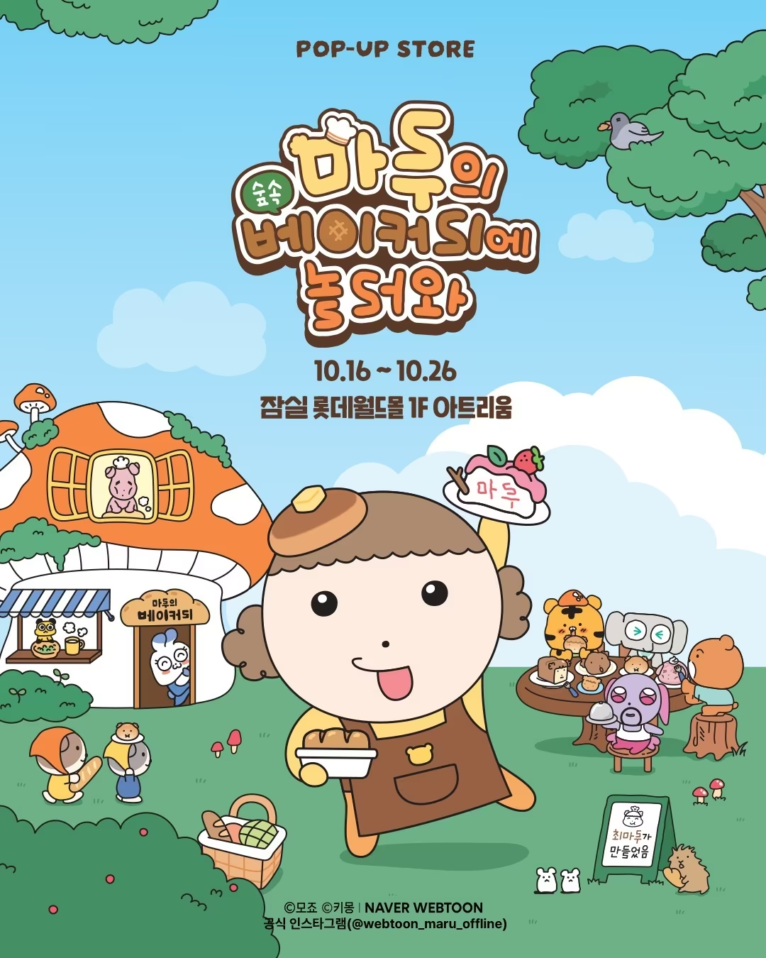 네이버웹툰의 슈퍼 IP ‘마루는 강쥐’의 새로운 팝업스토어 ‘마루의 숲속 베이커리에 놀러와’가 열린다. 이번 팝업스토어는 10월 16일부터 26일까지 서울 송파구 롯데월드몰 1층 아트리움에서 운영된다.