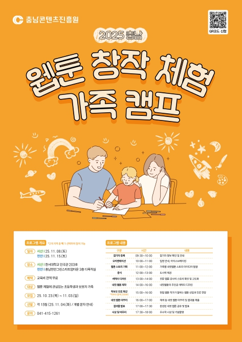 충남콘텐츠진흥원은 충남의 웹툰 문화 활성화와 가족이 함께하는 창의적 웹툰 문화체험을 제공하기 위해 ‘2025 충남 웹툰 창작체험 가족 캠프’를 개최한다.
