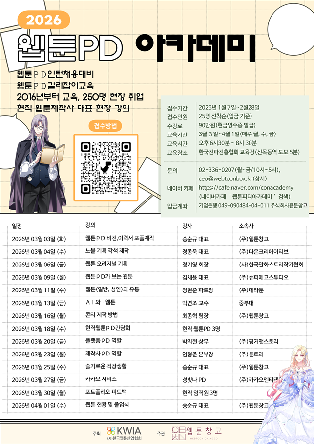 사단법인 한국웹툰산업협회(회장 서범강)가 주최하고 웹툰창고(대표 송순규)가 주관하는 ‘2026년 웹툰 PD 아카데미’가 수강생을 모집한다.