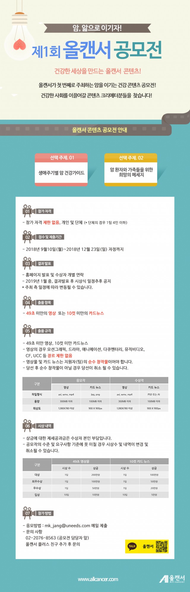 올캔서 공모전은 두 가지 주제 중 하나를 선택해 제출하는 방식이다. 참가자들은 '생애 주기별 암 건강 가이드'와 '암 환자와 가족들을 위한 희망의 메세지' 중 한 개의 주제를 택해 응모할 수 있다. 참가 자격에는 제한이 없으며 개인 혹은 단체(최대 4인까지 가능)의 형태로도 응모가 가능하다.