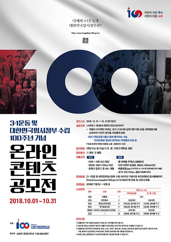 대통령 직속 3·1운동 및 대한민국임시정부 수립 100주년 기념사업 추진위원회에서 온라인 콘텐츠 공모전을 진행한다.