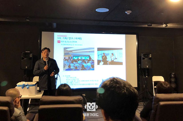 [사진=10월 25일, 웹툰가이드 강태준 대표가 회사소개에 이어 축사를 전하고 있다/웹툰가이드DB]