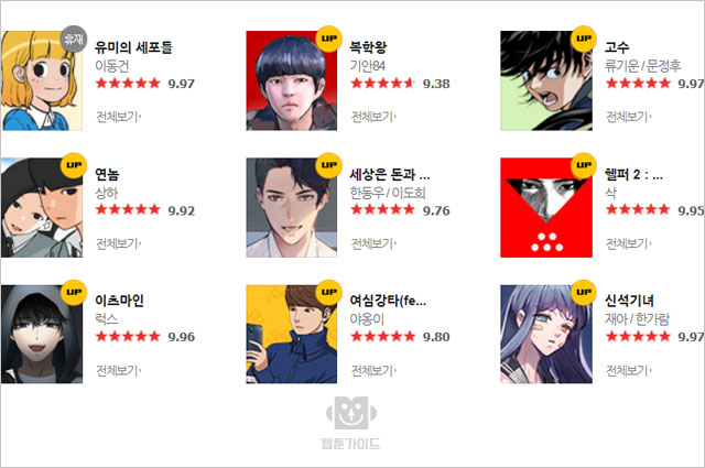 또 별점순 순위에서는 삼촌 작가의 '귀곡의 문'이 1위를, 조회수 2위를 기록한 '고수'가 별점순에서도 2위에 랭크됐다. 이어 Croissant 작가의 '고교생을 환불해 주세요', 휴재중인 촌장 작가의 '그 판타지 세계에서 사는 법'과 '유미의 세포들' 순으로 집계됐다.