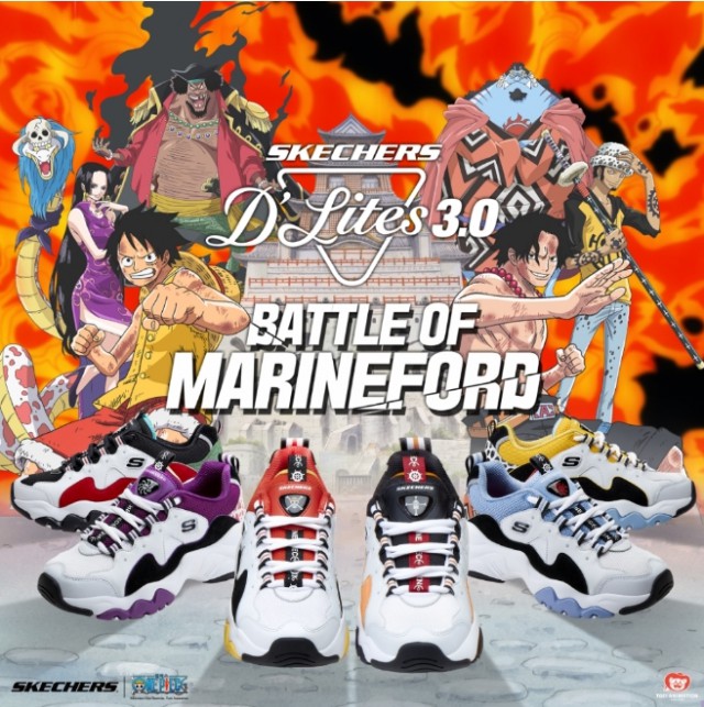 대원 미디어와 스케쳐스가 출시한 '원피스' 스니커스가 대표적이다. '루피' 시리즈에는 빨간색과 노란색. '에이스' 시리즈에는 주황색 등 각 캐릭터의 의상이나 능력을 색으로 표현했다. 캐릭터 사진은 신발 내부에서만 볼 수 있다.