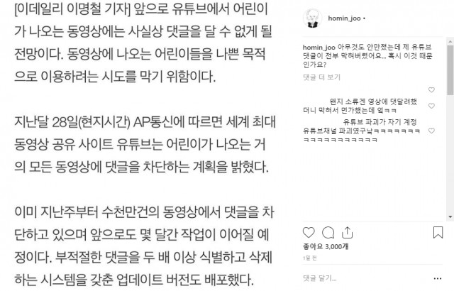 앞서 28일(현지시간), AP통신은 세계 최대 동영상 공유 사이트인 유튜브가 어린이가 나오는 거의 모든 동영상에 댓글을 차단하는 계획을 밝혔다고 보도한 바 있다. 이는 최근 유튜브가 소아성애자의 선정적 동영상 공유에 쓰이고 있다는 논란이 나온 데 따른 조치다. 이에 웹툰 작가 이말년과 김풍은 "주호민 머리 때문에 막힌 듯. 어린이 같아 유튜브가 댓글을 차단한 것"이라며 다양한 추측을 내놓았다.