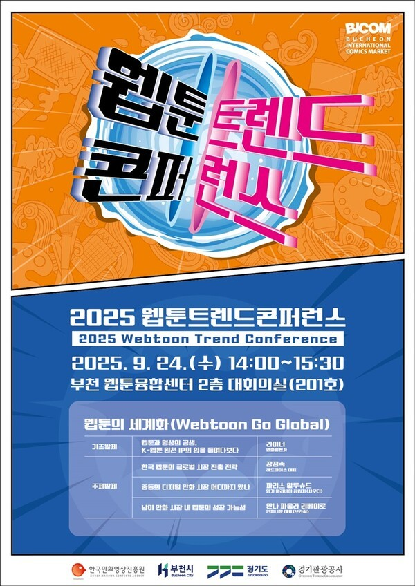 ‘2025 웹툰 트렌드 콘퍼런스’가 오는 24일 오후 2시 부천시 웹툰융합센터에서 열린다. 이번 행사는 한국만화영상진흥원(원장 백종훈)과 부천시(시장 조용익)이 주최하고, 경기도와 경기관광공사가 후원하며, 세계 웹툰 산업의 현황과 이슈를 점검하고 미래를 전망하기 위해 마련되었다.