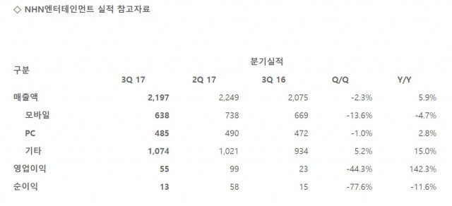 ▲NHN엔터테인먼트의 실적 참고자료. 단위는 억