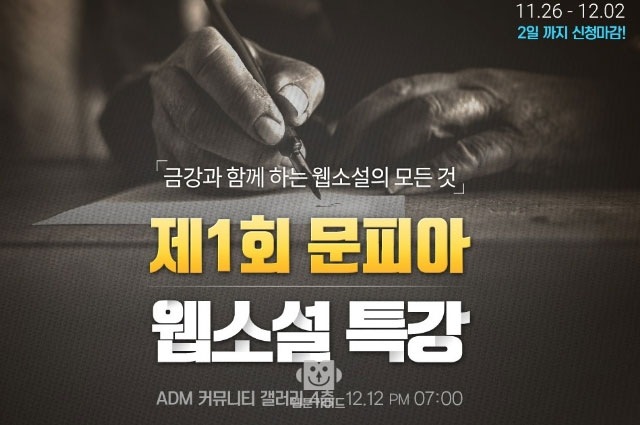 웹소설 연재 플랫폼 문피아는 다음 달 12일 오후 7시부터 서울 역삼 ADM 커뮤니티 갤러리에서 예비, 신인, 기성 작가를 대상으로 '제1회 문피아 웹소설 특강'을 개최한다.