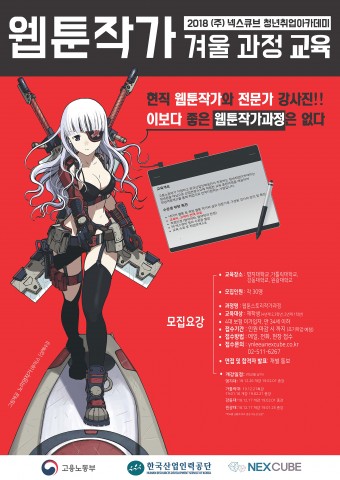 웹툰 전문 콘텐츠 제작 및 유통 기업인 (주)넥스큐브는 웹툰 신인 작가를 희망하는 대학 재학생을 대상으로 12월 14일까지 청년취업아카데미 ‘웹툰 스토리작가과정’ 교육생을 모집한다. 고용노동부와 산업인력공단이 주관하고 넥스큐브가 운영하는 청년취업아카데미 ‘웹툰 스토리 작가과정’은 취업을 연계하여 수강할 수 있는 교육이며 전액 무료인 국가지원 사업이다.