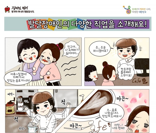 장애인먼저실천운동본부는 장애에 관련된 이슈나 에티켓을 소재로 한 장애인 권익 증진 웹툰 9편을 제작해 무료로 배포했다고 밝혔다.