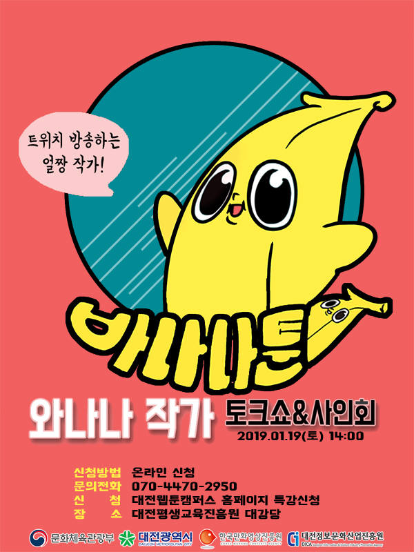 현재 레진코믹스에서 일상 개그물 '바나나툰'을 연재 중인 와나나 작가가 19일 오후 2시 대전평생교육진흥원에서 팬들과 만난다. 지난 14일부터 시작된 웹툰콘서트 사전예약에는 17일 총 294명의 신청자가 몰리면서 조기마감됐다.