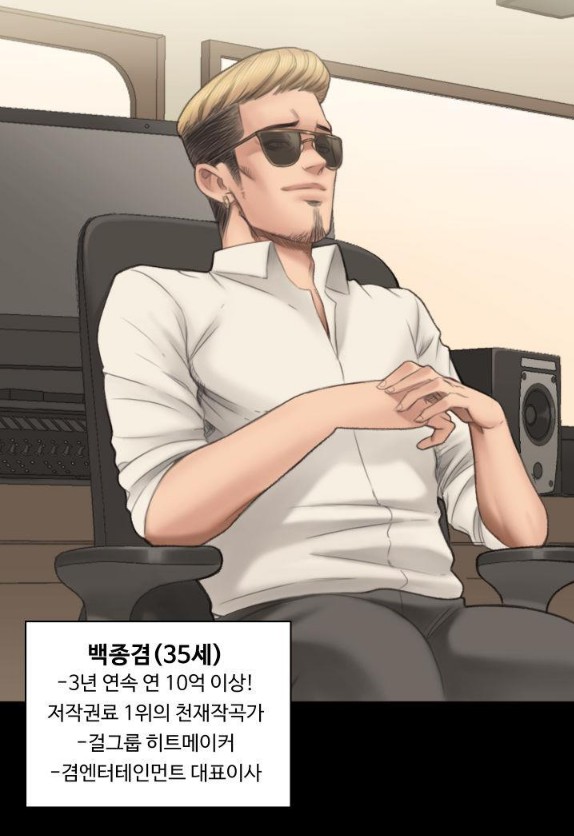 작품의 주연 중 하나인 백종겸. 위의 이미지에 명시된 것처럼 노래를 만드는 족족 히트시켜버리는 천재 스타 작곡가이다. 그러한 배경을 바탕으로 연예인 지망생들 또는 아직 빛을 보지 못한 걸그륩 아이돌들에게 노래를 주는 대가로 몸을 요구하거나 혹은 고위급 인사들에게 자신이 노래를 준 연습생들을 상납하며 스타로 만들어주는 등의 행태를 보인다. 무척이나 탐욕스럽고, 자신의 성욕에 충실한 악인처럼 보이지만 사정 없는 악역은 없는 법. 그 또한 태생부터 이런 인물은 아니었다.
