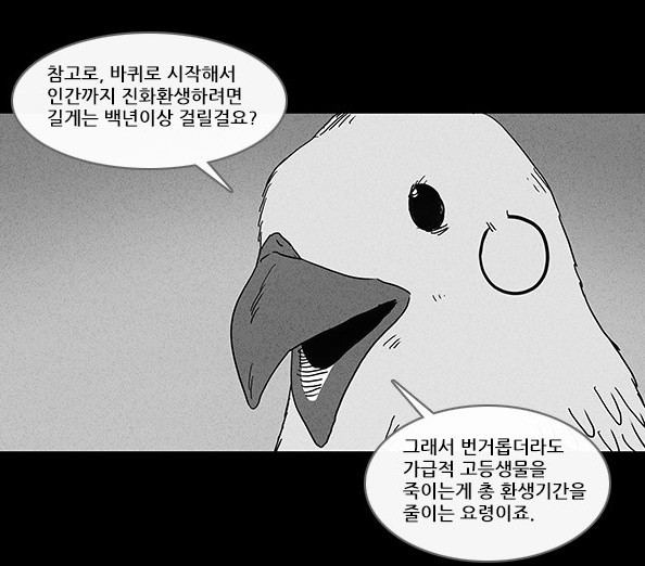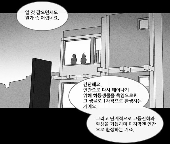 ‘특정 생물을 충분한 수만큼 죽이면 그 생물로 환생해 점차 고등생물로 환생을 반복함으로써 인간으로 다시 환생할 수 있다’는 설정으로는 어떤 이야기를 만들 수 있을까? 고등생물과 하등생물은 무엇인가에 대해 진화론적 접근을 하게 될까? 왜 인간으로 다시 태어나고자 하는가에 대한 이야기일까? 아니면 단지 사이비 종교에 대한 이야기일까? 주인공은 어떤 생물로 환생하게 될까?