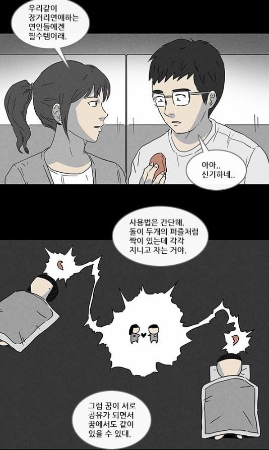 ‘하나의 돌을 둘로 나누어 가지고 있으면 꿈속에서 만날 수 있다’는 설정은 어떤 이야기를 낳게 될까? 에피소드 처음에 등장해 꿈공유석의 설정을 설명해주는 연인들의 이야기처럼 로맨틱한 이야기일까? 꿈에서조차 만나는 것에 질려버리는 이야기일까?