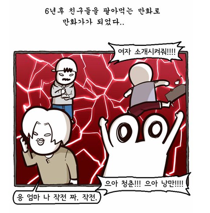 이 웹툰은 작가와 그 친구들이 주인공으로 나온다. ‘오대오맨’, ‘콧구멍맨’, ‘심술꾼’, ‘배달보이’, ’멀미남’ 등 친구의 특징이 될 만 한 것으로 이름을 선정했는데, 이것 역시 너무 일상적이었다. 주인공이 금수저, 외모나 두뇌가 뛰어난 특별한 사람들이 아닌 지극히 우리 옆에 있는 평범한 사람들이기 때문에, 독자들은 더욱 공감을 하기 쉽다. 군대를 가기 전날 세상이 무너지는
