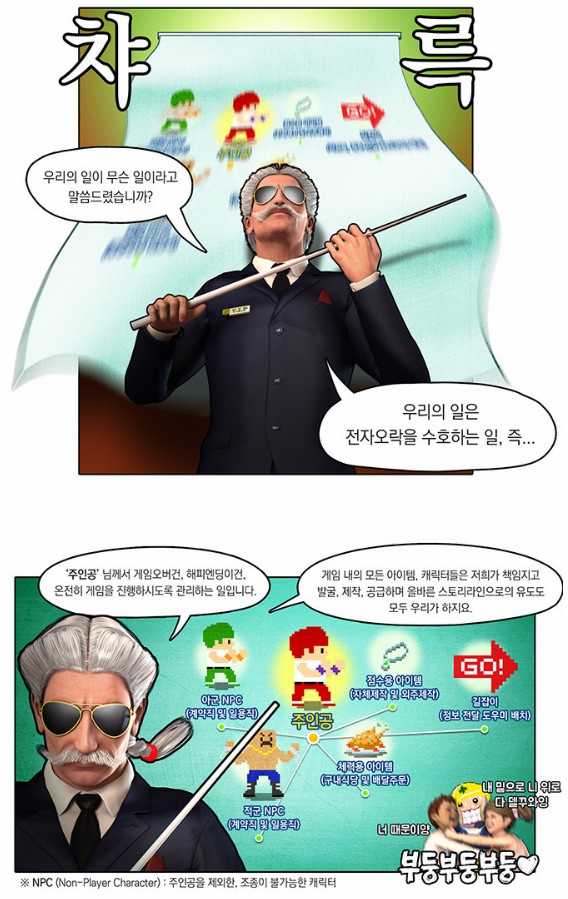 '선천적 얼간이'로 유명한 가스파드의 작품 '전자오락 수호대'에서는 우리가 게임을 할 때 필요한 음식이나 퀘스트 보상품. 그리고 NPC를 비롯해 적군까지도 전자오락수호대의 회사의 사원들이 마련해 주고 있음을 이야기 하고 있다. 또 재미있는 부분은 유저 뿐만 아니라 게임 속 캐릭터들까지도 이들의 존재를 들키면 안된다는 거다. 이 회사에서는 정체불명의 사장부터 팀장, 대리, 사원까지 하나의 단체를 이루고 있다.
