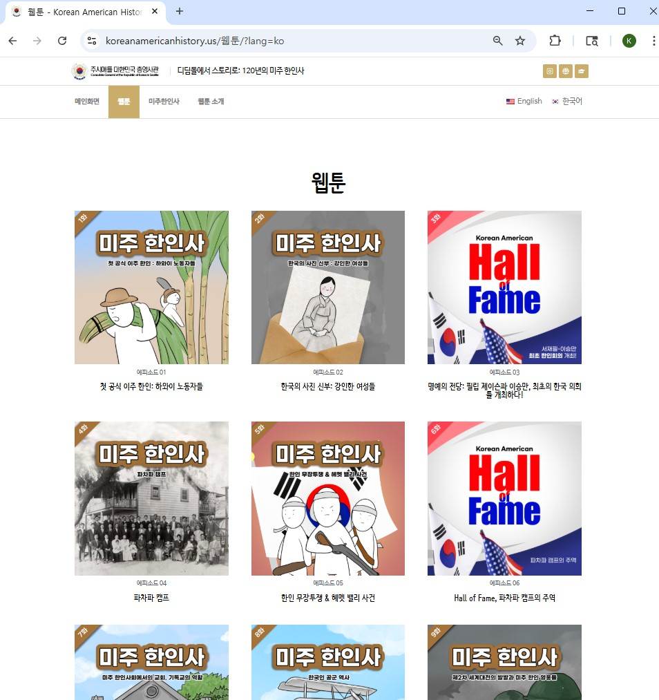 지난 4월부터 미국 한인 이민 120년 역사를 소개하는 웹툰을 시리즈로 만든 주시애틀한국총영사관이 최근 마지막 23편을 제작해 공식 웹사이트와 네이버 웹툰 플랫폼에 올렸다. 이로써 주시애틀한국총영사관의 미주 한인사 웹툰 시리즈 발행은 3개월여 만에 마무리됐다.