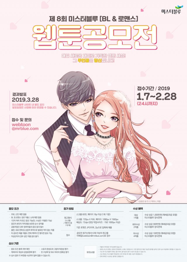 만화·웹툰·소설 전문 플랫폼 미스터블루는 지난 1월 7일(월)부터 2월 28일(목)까지 '제8회 미스터블루 BL&로맨스 웹툰 공모전'을 개최한다고 밝혔다.