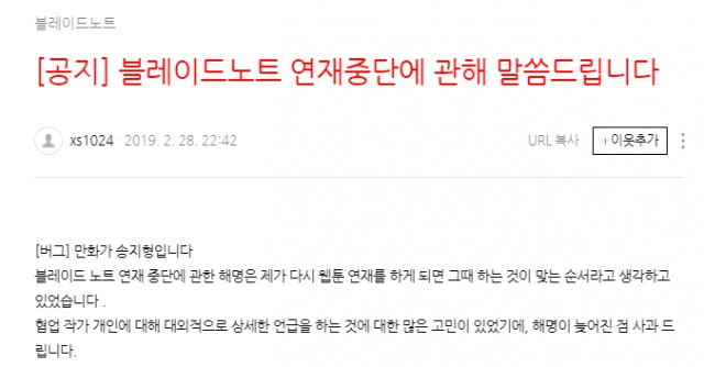 2016년 돌연 연재를 중단한 '블레이드 노트'에 관한 송지형 작가의 입장문이 지난 28일 공개됐다.