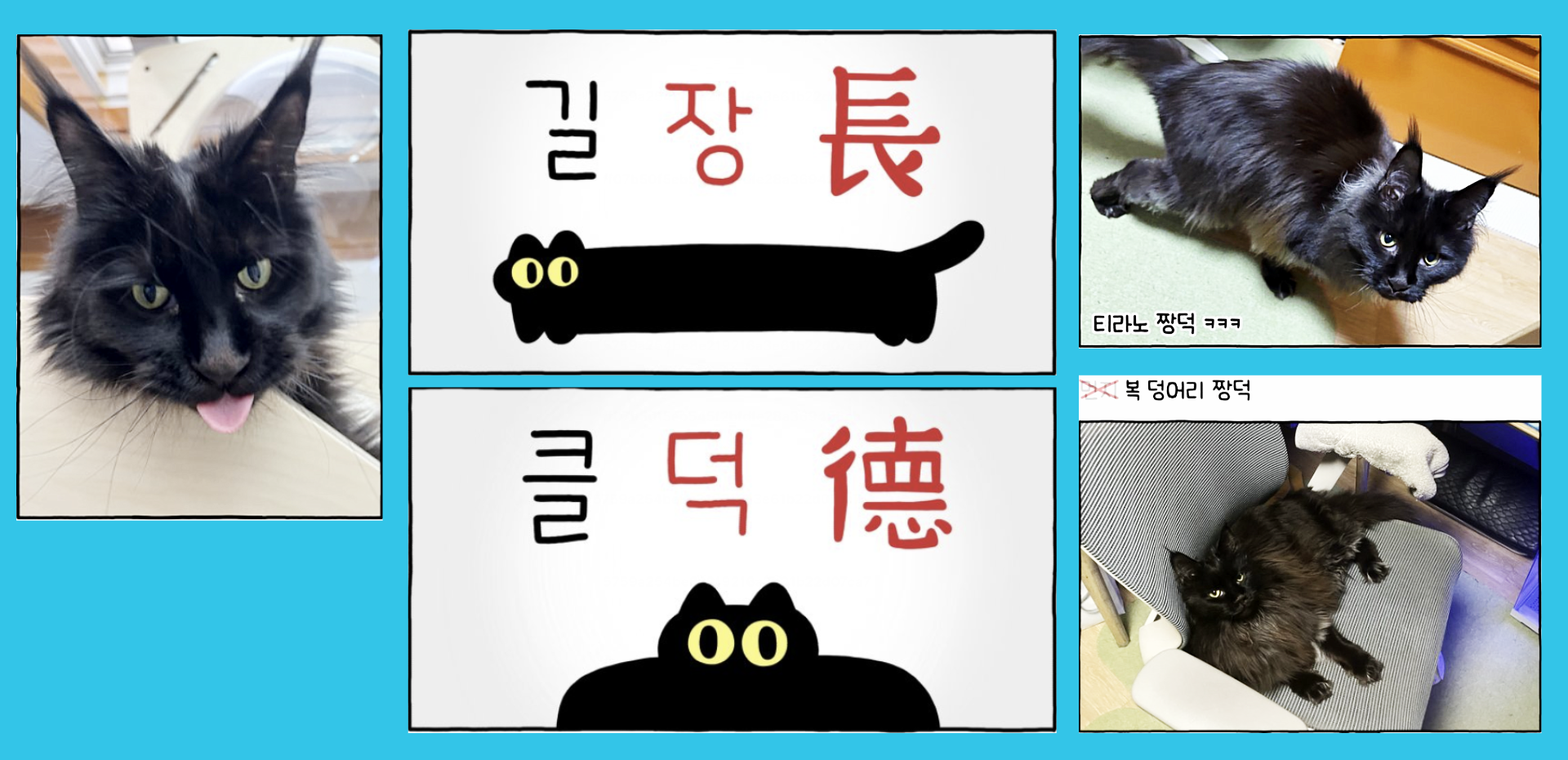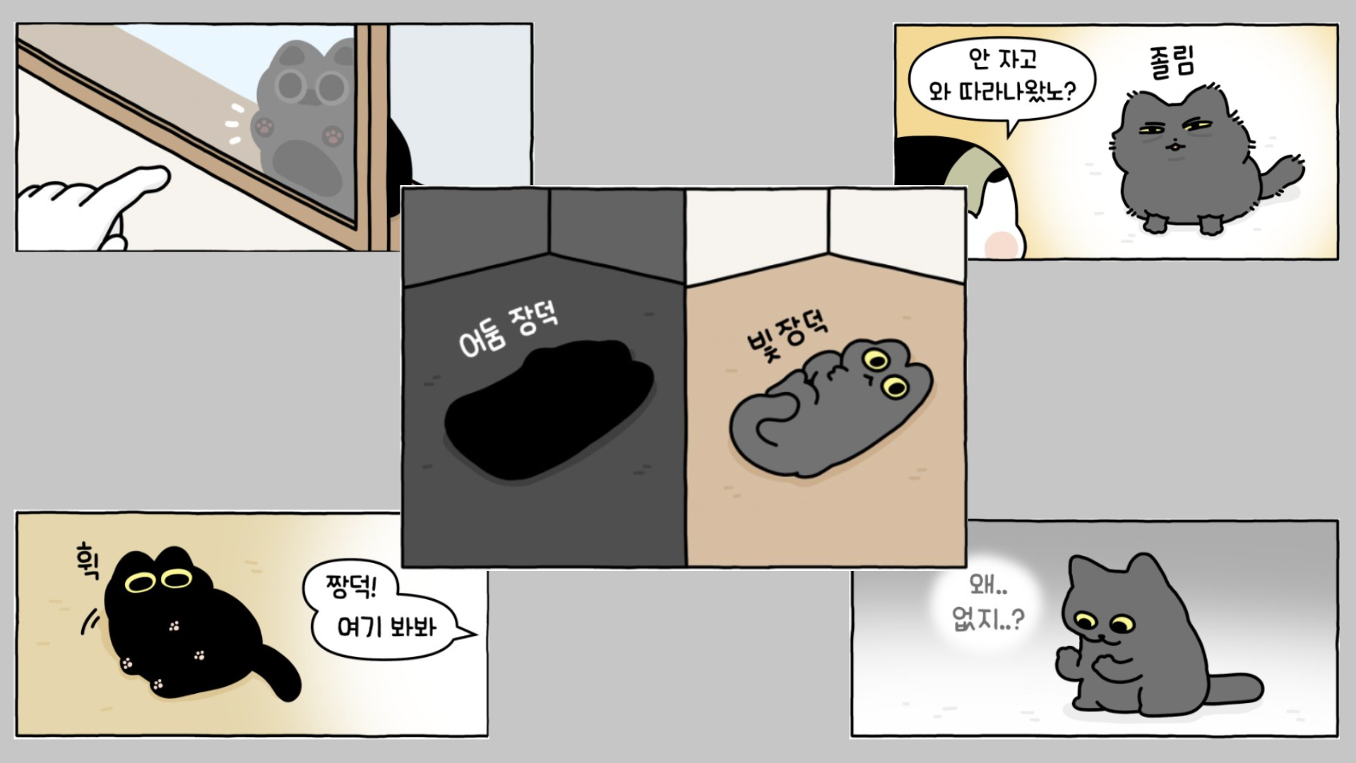 A. 짱덕이 캐릭터는 몸이 너무 새까맣다 보니, 여러 가지 귀여운 고양이 포즈들을
