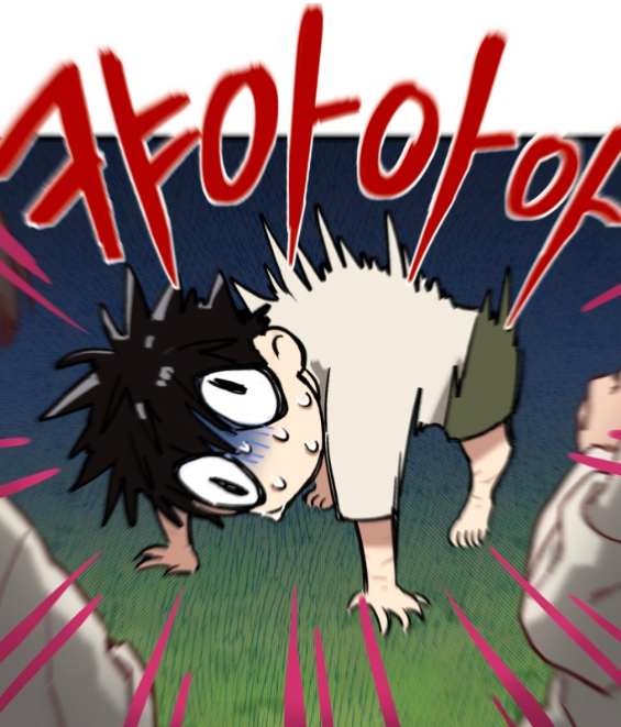 아이는 당황한 듯 고양이처럼 등을 잔뜩 세우고