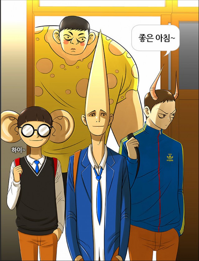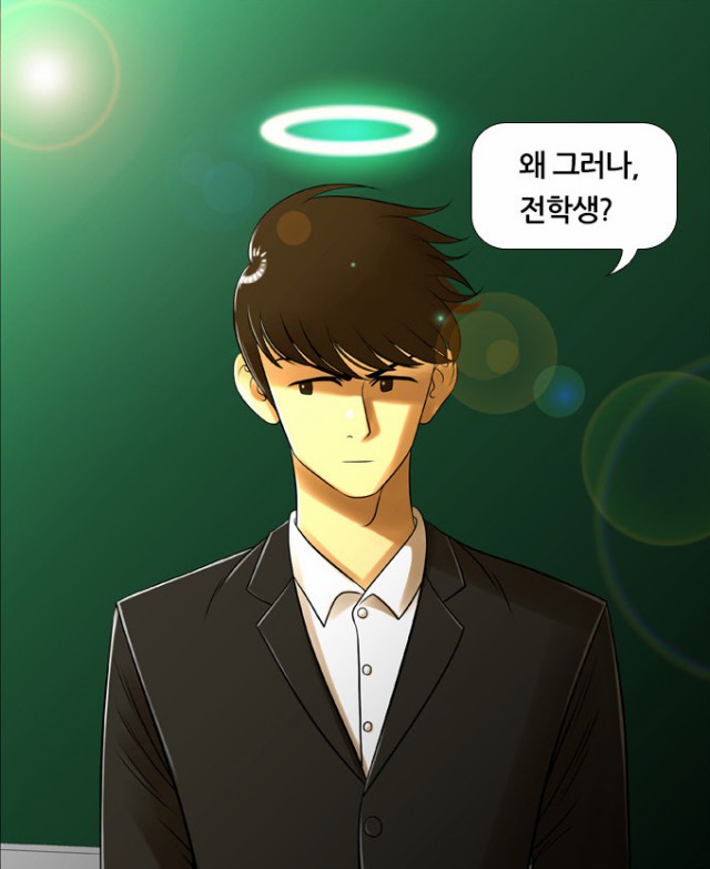 주인공의 상상을 아득히 뛰어넘는 장면이었다. 아주 엄청난 개성들을 가진 친구들로만 이루어진 반이었던 것이다. 그래서 서로가 서로를 봐도 놀라지 않고 아무런 감흥이 없다. 뿔이 달려 있거나, 엄청 큰 덩치를 자랑하거나, 귀가 무척 좋거나, 꼬리가 달려있거나, 필통에 들어갈만큼 작은 크기를 가진 친구들도 있다. 모두의 모습에 놀라고, 아무도 자신을 놀랍게 보지 않는다는 사실에 또 한 번 놀란다. 그리고 잠시 후 그의 담임 선생님이 들어오는데 놀란 동원은 팔이 긴 소년에게 묻는다. 아무래도 다들 평범하지 않다 보니 담임 선생님도 평범하지 않을 거라 생각한 탓. 그런데 자세히 보니 담임 선생님의 머리 위에는.. 링이 달려 있었다.