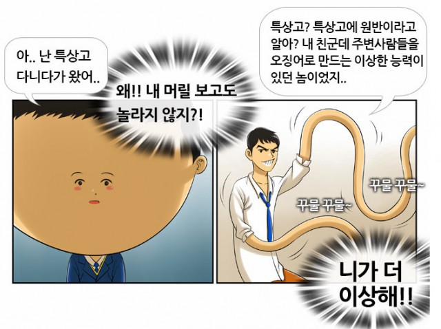 이 작품의 주인공인 동원이는 굉장히 커다란 머리를 가지고 있다. 태어날 때는 평범한 머리를 가지고 태어났지만 나이가 먹을 수록 점점 자라기 시작했다. 물론, 키도 자라지만 머리도 같이 자랐다. 병원에 가서 검사를 받았지만 원인은 알 수 없었고, 수많은 시술을 했으나 아무런 효과도 없었다. 본인은 어느 정도 익숙했지만 여전히 그를 바라보는 시선은 곱지 않다. 모두가 비웃고, 또 신기해하고, 두려워한다. 커다란 머리 때문에 일상에서도 불편함이 많다. 오죽하면 교실 정문에 머리가 끼어서 들어가지 못한다. 그러나 정작 머리가 낀 자신보다 자신의 머리로 인해 통행이 방해되었다는 것에 더 미안함을 느끼는 소년이다. 커다란 머리만큼이나 따뜻한 마음을 가진 소년이지만 그에게 이러한 일상은 너무나 괴롭고 힘들다. 그래서 그의 어머니는 결국 결정을 내린다. 다양한 개성을 가진 아이들이 모인 고등학교로 전학을 가는 것이다.