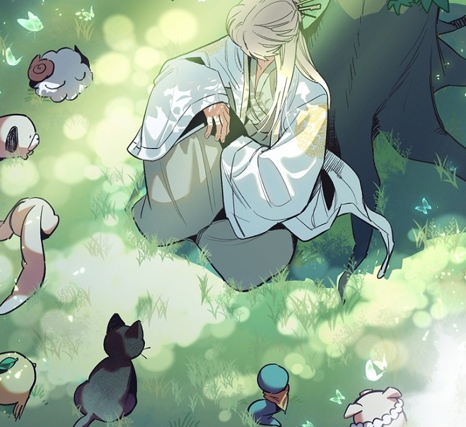 여러 동물들에 둘러싸여 앉아있는 남자는 이제